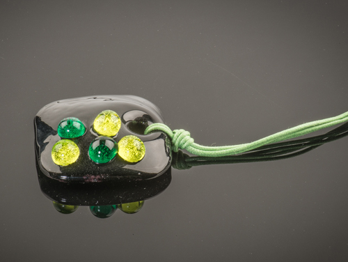 Zwarte glazen ketting gemaakt op Murano, klein eilandje bij Venetie, door een Italiaanse ontwerper. Het glas wordt gesmeed. Deze glazen hanger is afgewerkt met 5 bubbles in limoen groen en donkergroen. De druppels zijn bewerkt met zilver, daardoor lijken de bubbles op dauwdruppels op een blad. Prachtig glazen sieraad dat uw outfit compleet maakt.