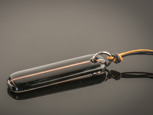 Zwarte, transparante hanger van Venetiaans glas, gemaakt in Murano, een klein eilandje bij Veneti?. De glazen hanger is zwart met een dunne, strook koper erin verwerkt waardoor de ketting heel uniek is.