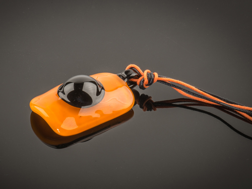 eilandje bij Veneti?. De glazen hanger is gesmeed uit oranje en zwart glas. Aan deze hanger zit een oog dus