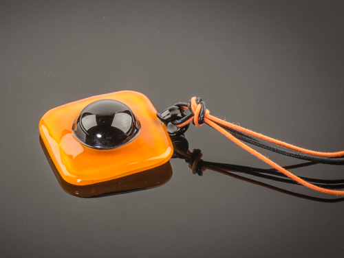 eilandje bij Veneti?. De glazen hanger is gesmeed uit oranje en zwart glas. Aan deze hanger zit een oog dus