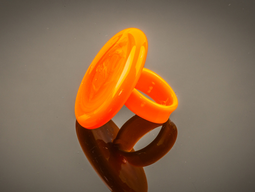 Ring gemaakt van oranje Venetiaans glas. De ring lijkt op een grote paddenstoel. De gehele ring is van