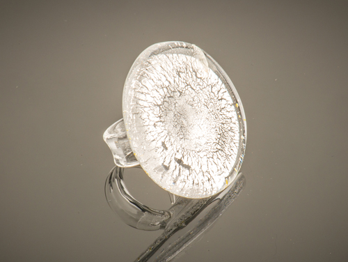 Ring gemaakt van transparant Venetiaans glas met een gecrackeleert blaadje zilver erin verwerkt. De ring lijkt op een grote paddenstoel. De gehele ring is van glas gemaakt. Deze ring past bij elke outfit, een musthave? Deze sieraden worden met de hand gemaakt dus elk exemplaar is uniek. De ringmaat staat aangegeven in mm.