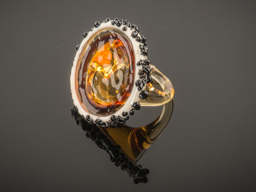 Stoere glazen ring in helder amberkleurig glas omrand met een beige rand met zwart korreltjes. Het lijkt wel een snoepje van glas. Met deze glazen ring steelt u de show"The finishing touch" voor uw kledingstuk. Het is Venetiaans glas gemaakt op het eiland Murano, dichtbij Veneti? door een Italiaanse designer. Het glas is gesmeed en nadat de ring klaar is, wordt de ring in 24 uur in een oven terug gekoeld naar 0 graden zodat de ring extra sterk is.