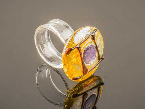 goud en bruine strepen. Middenin de glazen ring een kleine cirkel van paars glas.
