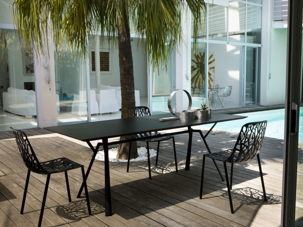 het Italiaanse merk Fast. Nieuwe optie iroko houten poot onder het aluminium frame, meerprijs €175.