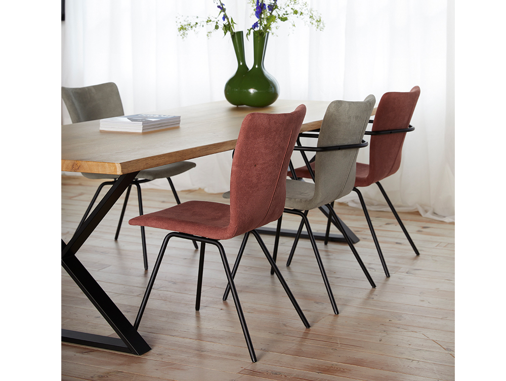 “Een vergader / eettafel stoel die echt lekker zit, dat is waar ik naar op zoek was. Vanuit mijn ergonomische achtergrond is de Movi stoel zo ontworpen dat de zit net iets hoger is dan standaard en de rugleuning de natuurlijke curve van je rug volgt. Een stoel die je gelijk omarmt en zit als een maatpak. Door hem standaard uit te voeren in verschillende frame kleuren, kun je de stoel helemaal naar jouw eigen smaak ontwerpen.” Zegt Monique de Groot die creative director bij www.vke.nl en houdt zich dagelijks bezig met het ontwerpen en inrichten van werk- en leefomgevingen. Dit doet zij volgens het unieke WAVE principe: werkplek, akoestiek, verlichting en ergonomie. Pas als al deze onderwerpen kloppen, heb je een werkplek die echt bij je past! De stoel is leverbaar in diverse stoffen, kunstleer en leer. Stalen onderstel verkrijgbaar in: mat zwart, mat wit, antraciet en groen, mat donkerrood, mat blauw, RAL 8012 rood, RAL7021 zwart, RAL 1013 Creme wit en RAL1000 geel. Prijzen vanaf €445 t/m €720.