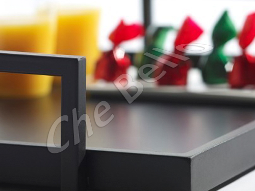 Strak vormgegeven dienblad van zwart hout. Dit fraaie dienblad is een ontwerp van een designer van de groep Studio Mango.